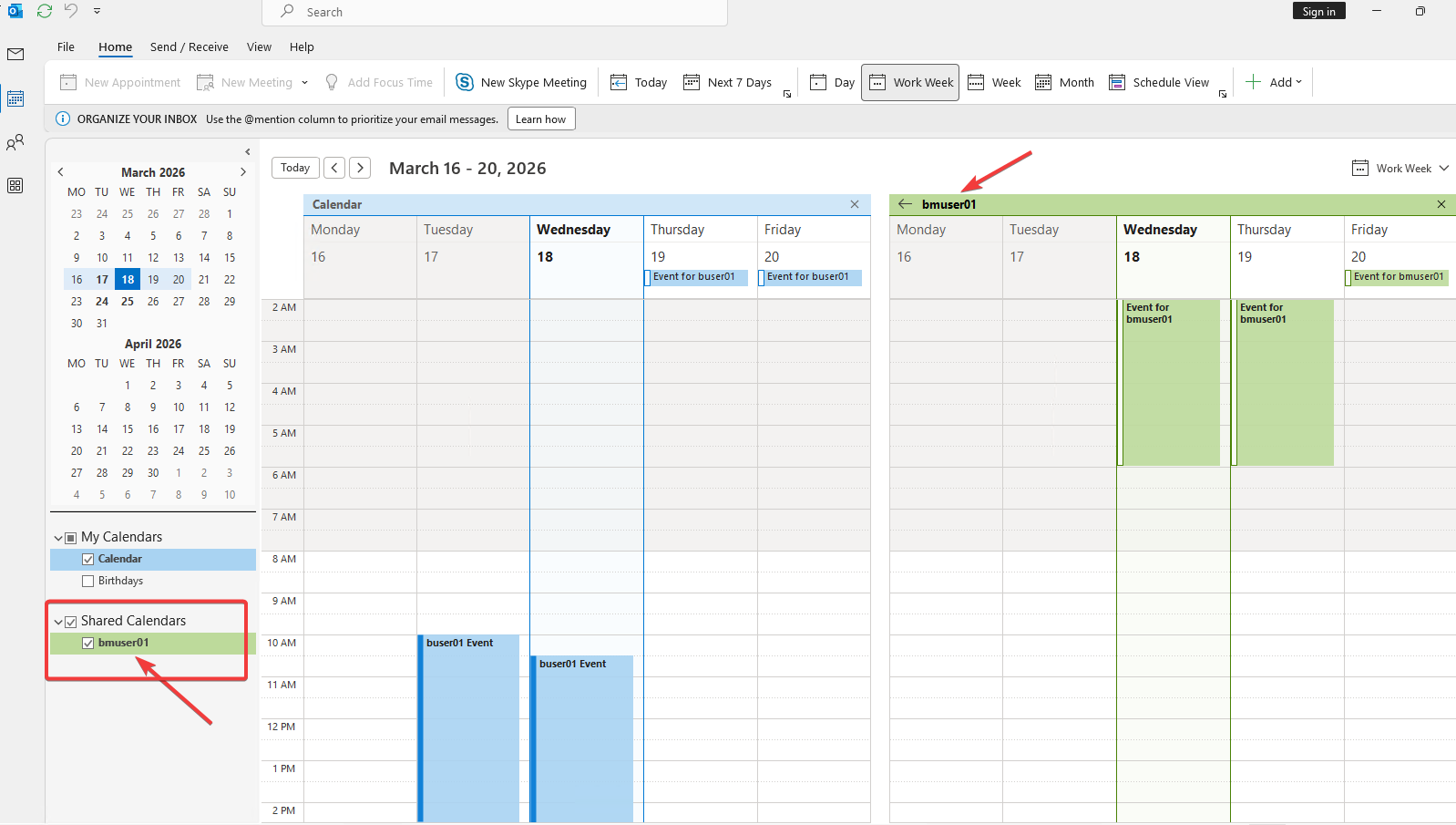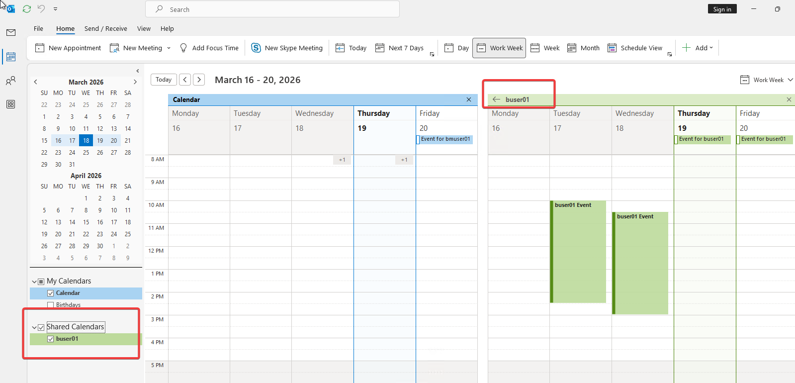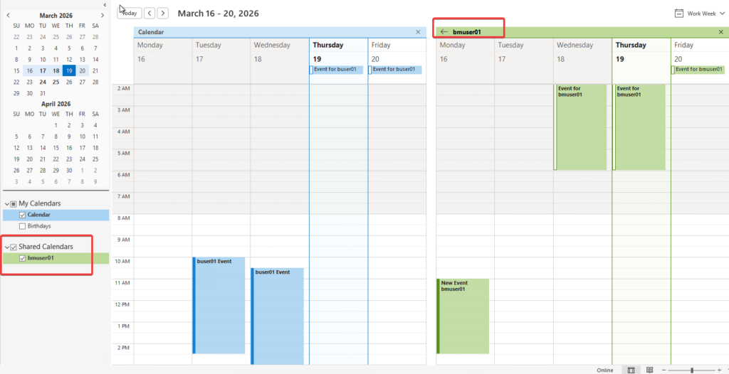 Shared calendar access continues to work in both directions after migration. The on-prem user can access the Exchange Online mailbox shared calendar, and the Exchange Online user can access the on-prem mailbox shared calendar without any issues.